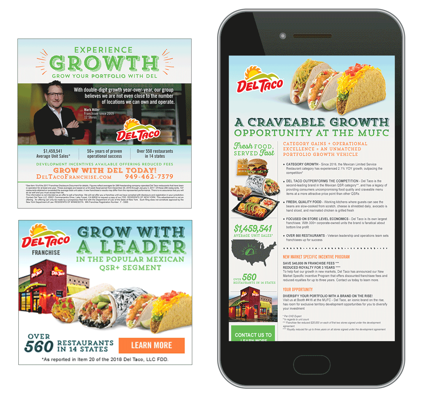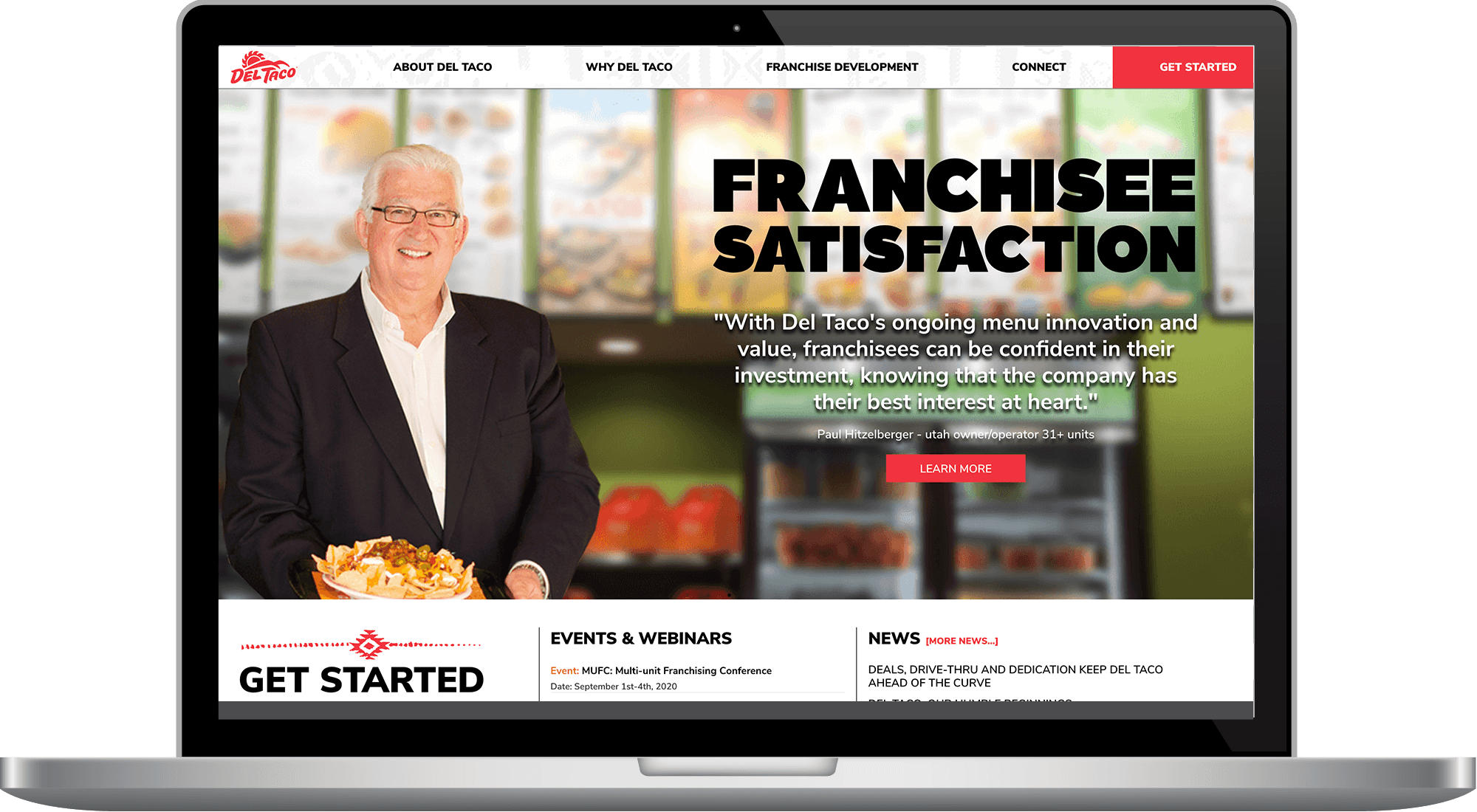We designed Del Taco's franchise development website as a tool to efficiently funnel investors and franchise candidates through a single system. Working with their franchise development team, we also collaborate on marketing campaigns that align with major events and meetings, handling strategy, design, development, and media buys.